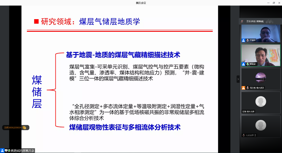 2020年12月15日,应公司严德天教授和周三栋教授邀请,伟德bv1946官网(北京)姚艳斌教授同师生线上交流并作题为“煤储层物性与流体特征分析新技术:核磁共振”的学术报告。