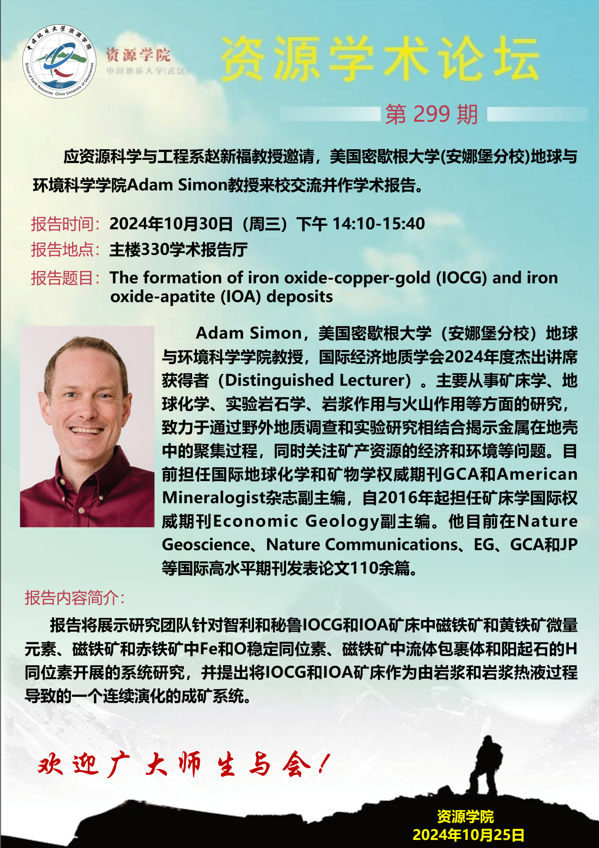 【10月30日】第299期资源学术论坛:Adam Simon学术报告