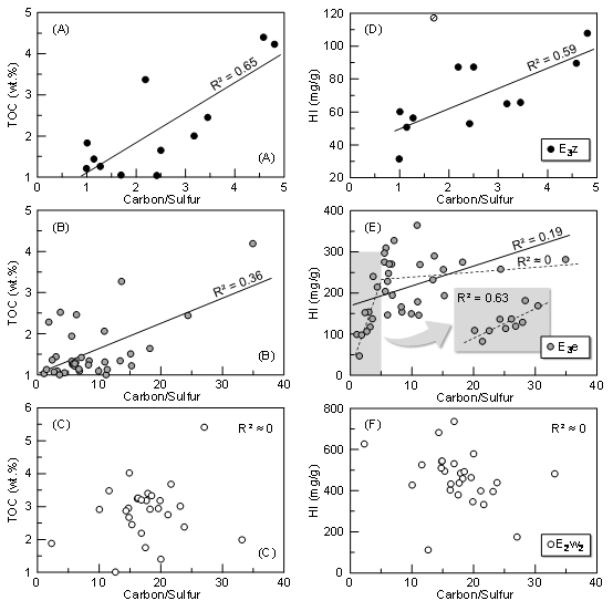 图2 珠江口盆地珠三凹陷烃源岩碳硫比频率分布