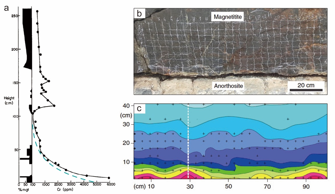 南非Bushveld岩体水平延伸超过400km,厚度可达7-9km,是陆地上出露规模最大的层状岩体,自1960年代以来就被作为深部岩浆房过程的绝佳研究对象。岩体上部含多个磁铁矿层,基本以磁铁矿为主(含量在90-95%以上),部分矿床厚度可达1-2m以上,产出了世界上规模最大、品位最高的钒钛磁铁矿石(图3)。由于Cr元素在磁铁矿中有着较高的分配系数(100-300),因此岩浆房中早期结晶的磁铁矿具有较高的Cr含量,而随着熔体中Cr的不断消耗,后续晶体中Cr含量迅速降低,因此磁铁矿层中Cr含量的垂向变化跟结晶分异过程有着极其密切的联系。人们以此为切入点,在1980-1990年这十年间针对磁铁矿层开展了大量的工作,以期能够精细地刻画深部岩浆房的分离结晶过程。测试所得的磁铁矿层Cr含量剖面确实表现出自下向上的迅速降低,但是其与熔体中“晶体均匀成核-重力沉降”这一经典模型的结晶分异模型结果存在几处明显的不相符(图4a):1、相对于模拟结果,矿层底部Cr含量的下降更为快速;2、矿层顶部Cr元素含量又保持相对稳定,并未表现出结晶分异模型所要求的持续降低;3、Cr含量经常会在某一位置迅速升高,形成一个明显的反转。为了使模拟结果与实测剖面相吻合,早期科学家在模型参数上做了非常多的尝试,比如假设体系内不断有外来Cr的扩散补给,而相关的补给速率又需要随磁铁矿结晶速率而不断地改变,最终使得相关的热力学模拟工作逐渐演变为数学上对实测Cr剖面的曲线拟合。