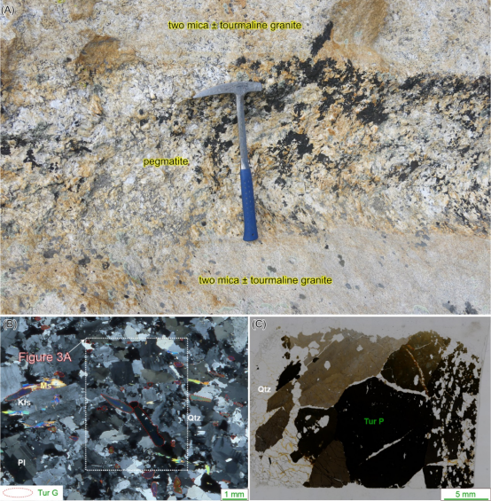 图1(A)错那洞淡色花岗岩中二云母±电气石花岗岩与伟晶岩的关系;(B)二云母±电气石花岗岩显微照片;(C)伟晶岩显微照片