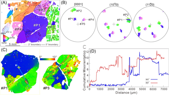 图4伟晶岩中电气石(TurP)的EBSD测量结果(A)晶体取向分布图,颗粒颜色对应左下角X方向反极图;(B)晶体取向散点图,颜色与A图对应;(C)电气石颗粒(#P1,#P3)内部的取向差分布图;(D)电气石颗粒(#P1,#P3)的取向差剖面图。