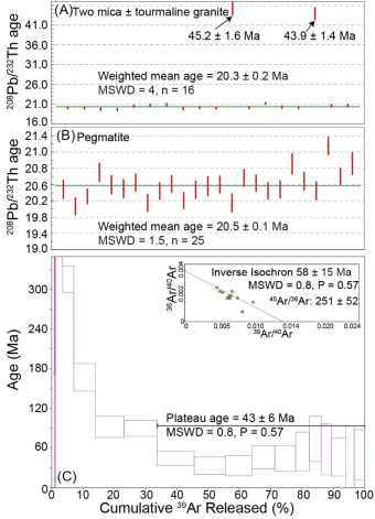 图2(A)错那洞淡色花岗岩中二云母±电气石花岗岩独居石定年结果;(B)错那洞淡色花岗岩中伟晶岩独居石定年结果;(C)伟晶岩中电气石Ar-Ar定年结果