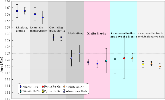 图1.华北克拉通玲珑矿田岩浆活动和成矿作用年龄图谱