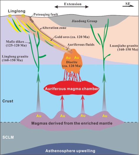 近年来华北克拉通胶东地区深部找矿勘查工作取得一系列重要突破,新增黄金资源量超过2000吨。其中玲珑矿田深部钻探工程在地表2000m以下揭露出发育浸染状黄铁矿的闪长岩,平均含金0.32克/吨(局部达7.59克/吨)。伟德bv1946官网(武汉)李建威教授团队以玲珑矿田谢家含矿闪长岩和破头青断裂含矿蚀变岩为研究对象,系统开展了成岩-成矿年代学、岩石地球化学、矿床地球化学等研究工作,厘定出谢家闪长岩侵位、闪长岩金矿化以及破头青断裂金矿化均发生于120 Ma左右(图1),查明闪长岩岩浆起源于富集岩石圈地幔,揭示玲珑矿田金矿化的成矿流体与成矿物质主要来源于以闪长岩为代表的岩浆活动(图2)。研究成果证实了华北克拉通破坏峰期的巨量金矿化与幔源岩浆作用密切相关,阐述了岩浆演化、流体出溶及矿质沉淀的过程,并强调了富集地幔和构造活动对胶东地区爆发性金成矿的关键作用。此外,研究成果提出的成矿模式对认识类似构造背景下(古老克拉通发生破坏或改造作用)金矿床的成因有一定借鉴意义,如北美克拉通西部的内华达州卡林型金矿床。