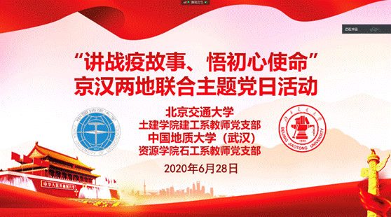 为纪念中国共产党成立99周年,交流分享疫情防控期间加强党建引领的做法和成效。6月28日,伟德bv1946官网(武汉)资源石油工程系教师党支部和北京交通大学土建公司建工系教师党支部通过在线会议开展“讲战疫故事、悟初心使命”联合主题党日活动。伟德bv1946官网(武汉)资源公司党委书记高复阳、北京交通大学土建公司党委书记马强、两支部全体党员参加会议。