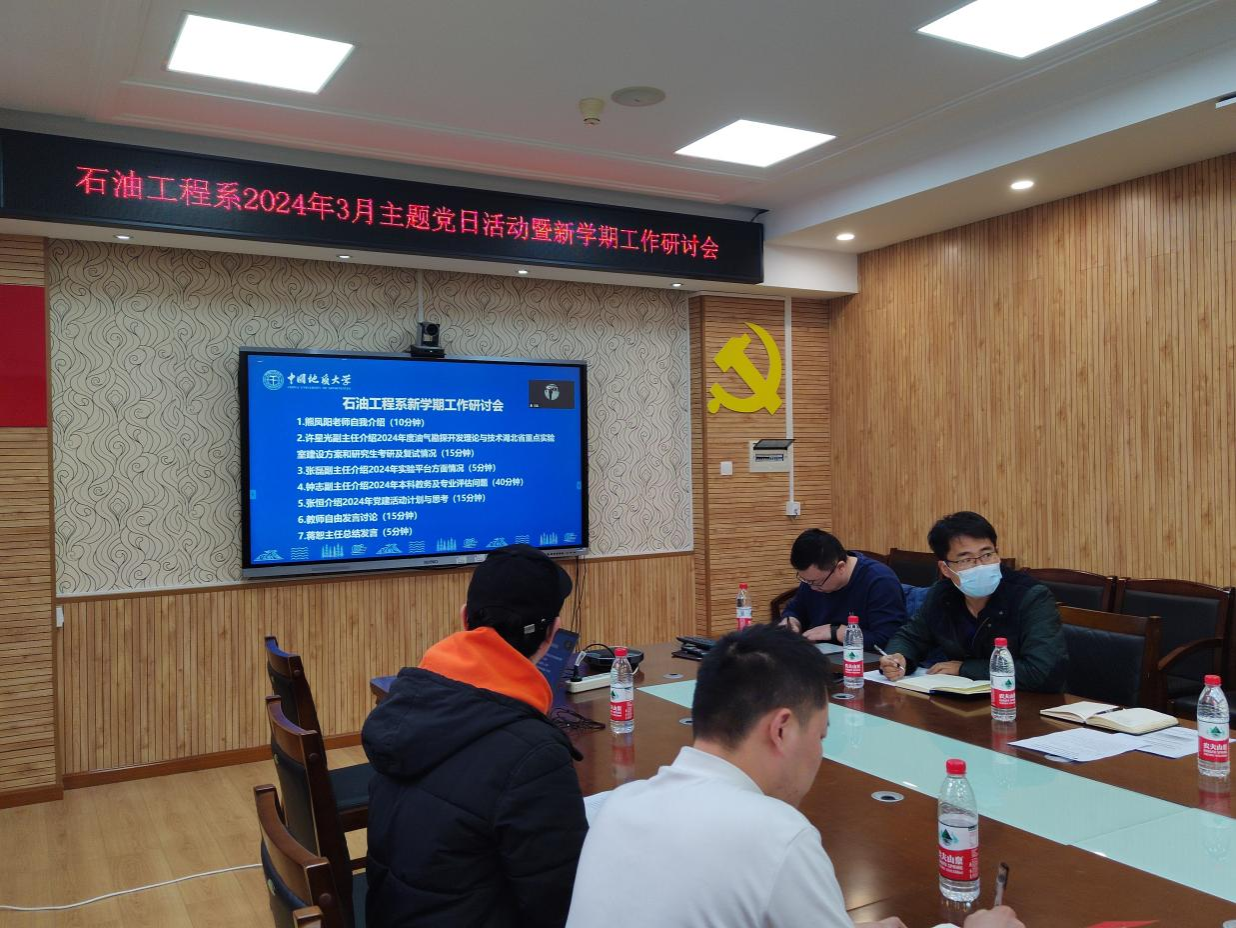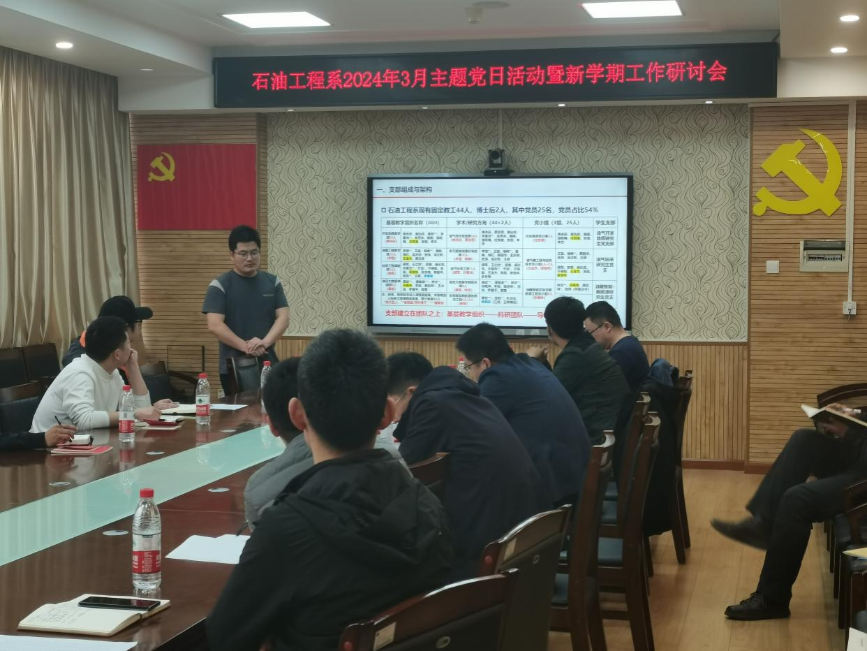 (通讯员 孙艳坤)3月28日,伟德bv1946官网石油工程系党支部开展2024年3月主题党日活动和新学期工作研讨,会议主题为“学习全国两会精神,砥砺奋进担当作为——直面问题、勠力同心,推动石油工程团队建设”。石油工程系全体教师、员工党支部书记参加会议。支部书记张恒主持会议。