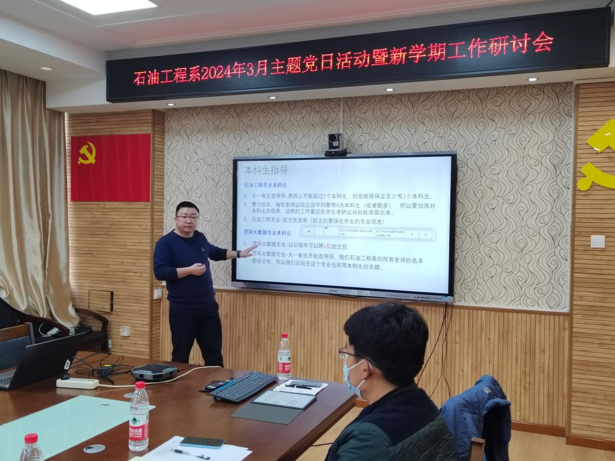 随后,与会人员围绕石油工程系新学期工作展开研讨。石油工程系新进教师熊凤阳老师从个人教育与工作经历、科研方向与成果、学术影响与合作关系以及未来规划等四个方面做自我介绍与交流。系副主任许星光介绍了2024年“油气勘探开发理论与技术”湖北省重点实验室相关建设规划。系副主任张磊汇报了石油工程系平台建设的情况。系副主任钟志以2023年石油工程专业自评估报告为基础,从自评估报告中评价指标问题、野外实习指导、教材建设、课程建设、本科生指导和2024年石油工程专业工程教育认证筹备等方面汇报了石油工程专业本科教务方面的情况。