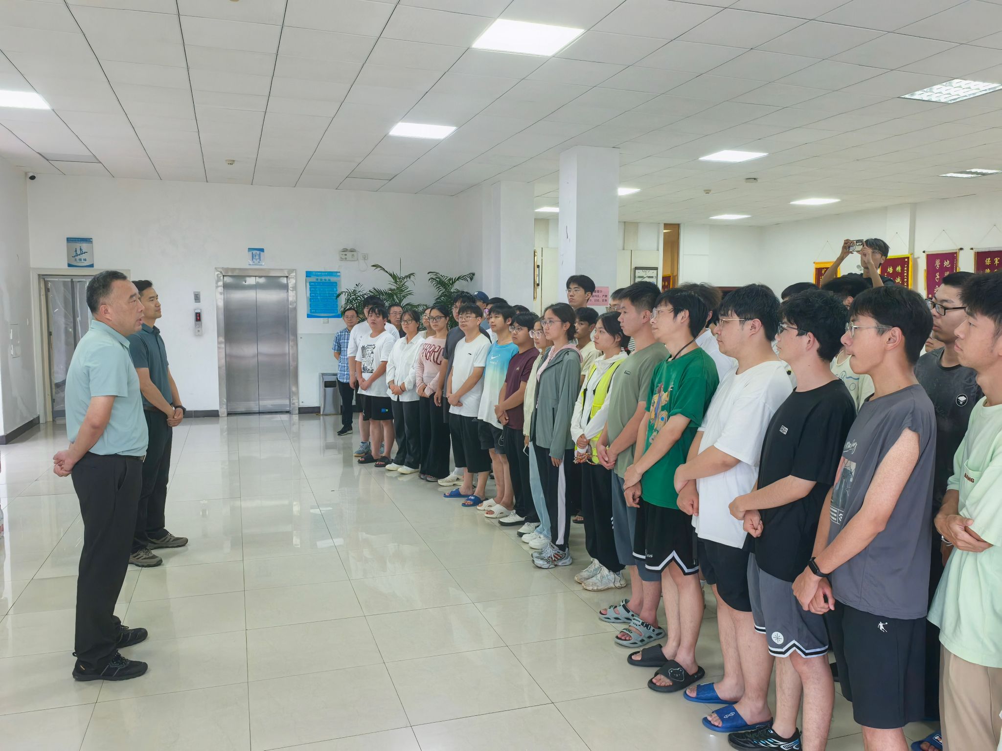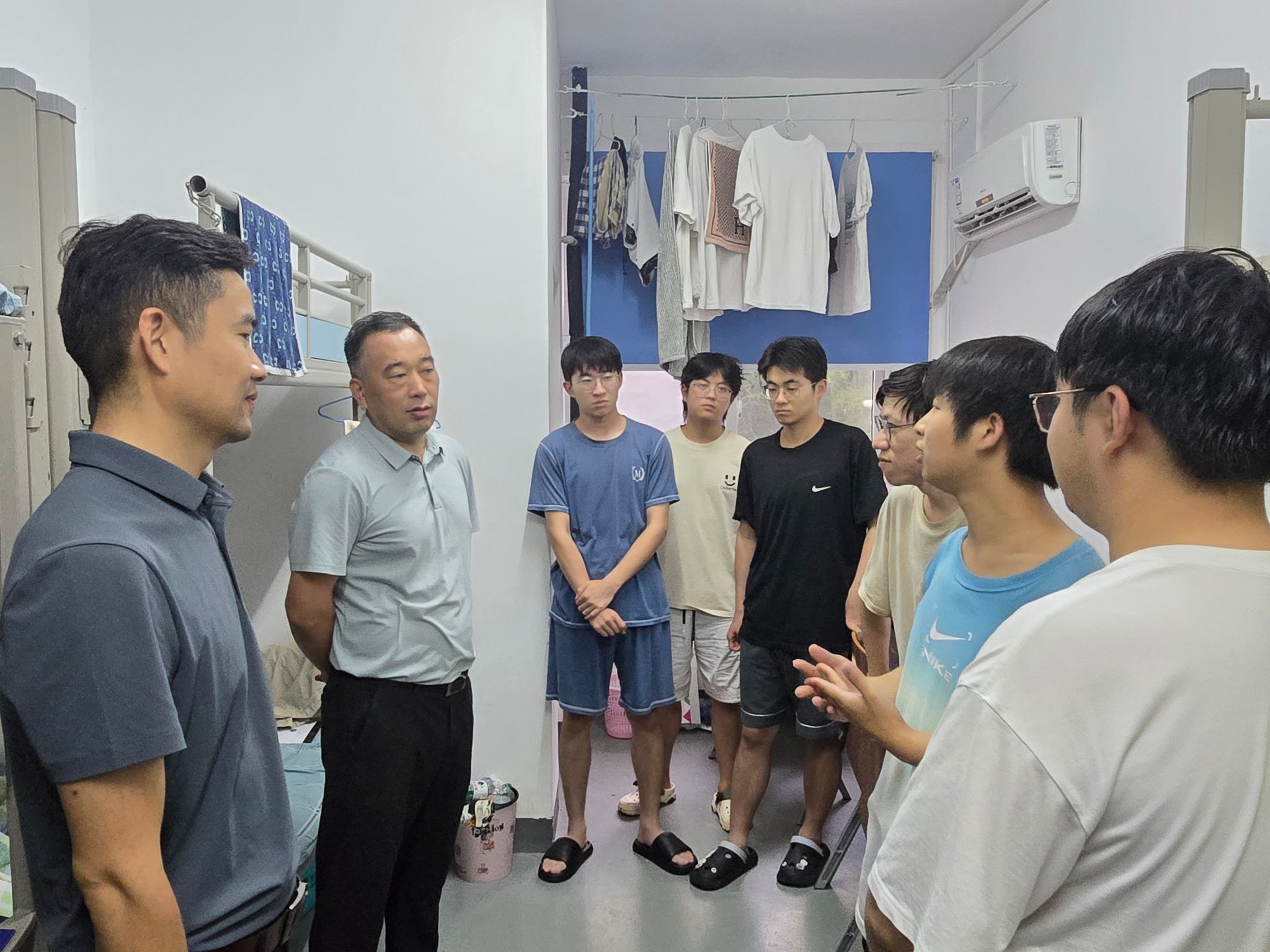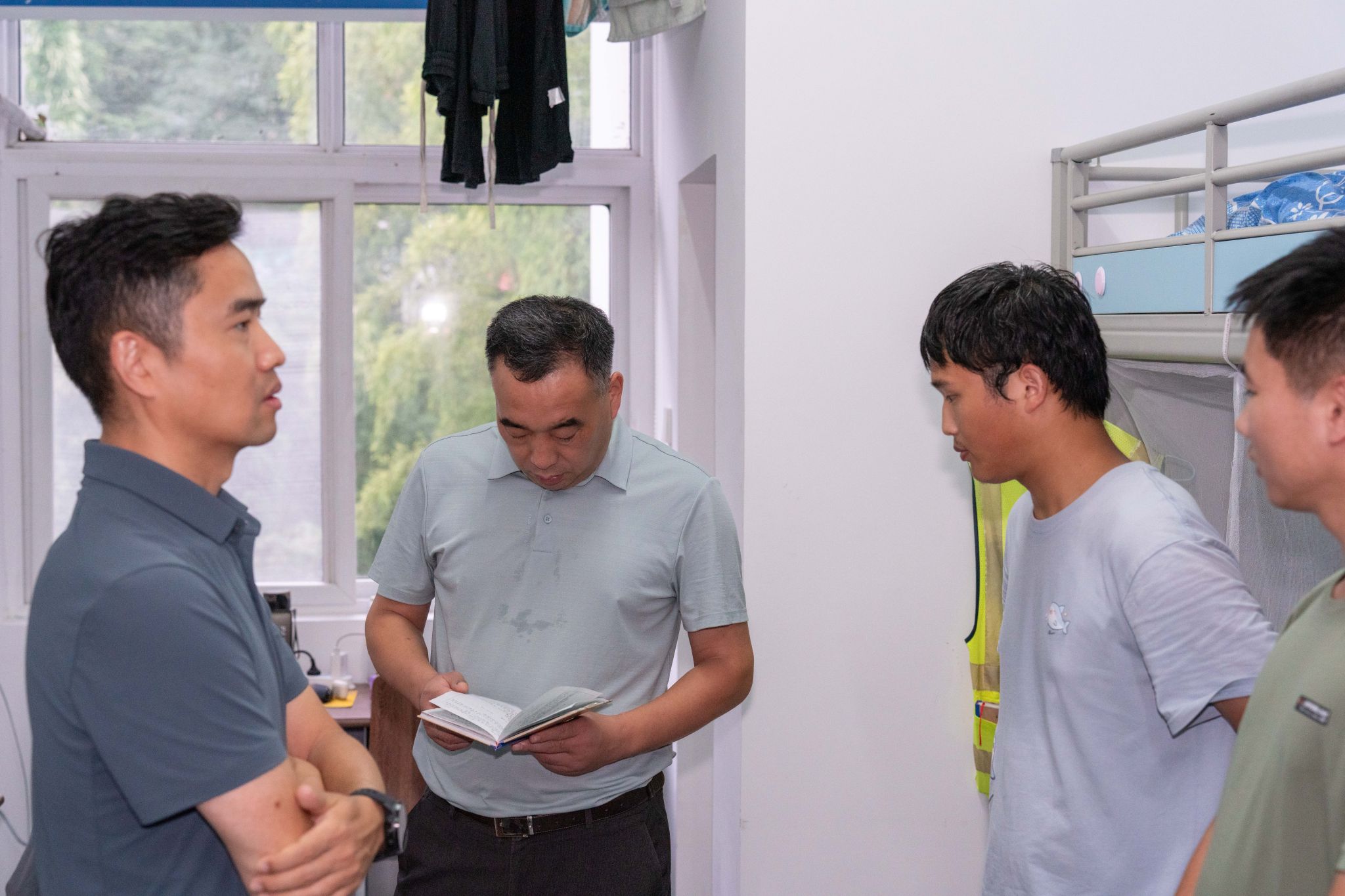 随后,经理一行走进男生宿舍,关怀同学们的起居生活,查看野外记录簿,并就实习感受与对秭归实习的建议意见与大家亲切交谈。他表示,公司将积极研究引入无人机等新技术手段,丰富“地质新三件”教学应用,进一步提升野外实践教学的质量与实效。