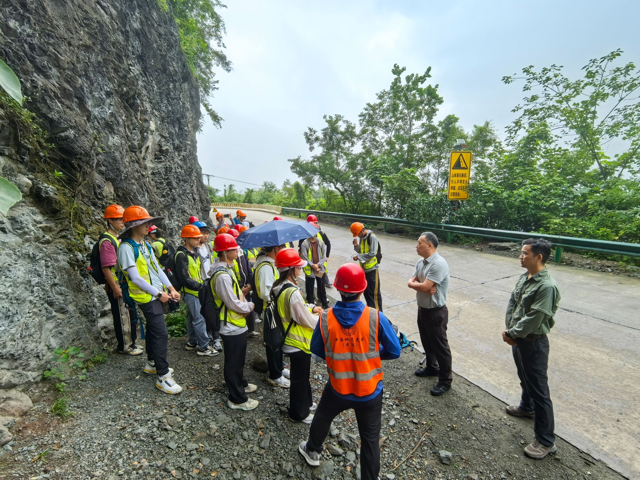 12日上午,朱红涛、李占轲等一行踏勘花鸡坡教学线路,察看野外实践教学开展情况。在现场,公司实习队队长李嘉光介绍了今年野外教学的创新举措,实习队学术指导刘晓峰介绍了教师集体备课情况。他表示,秭归实习基地依托区域特色地质地貌,为同学们提供了极其宝贵且直观的野外实践平台,他希望大家把握机遇,勤于思考、勇于发问,不仅要掌握识别方法,更要理解地质演化规律,真正做到“知行合一”。