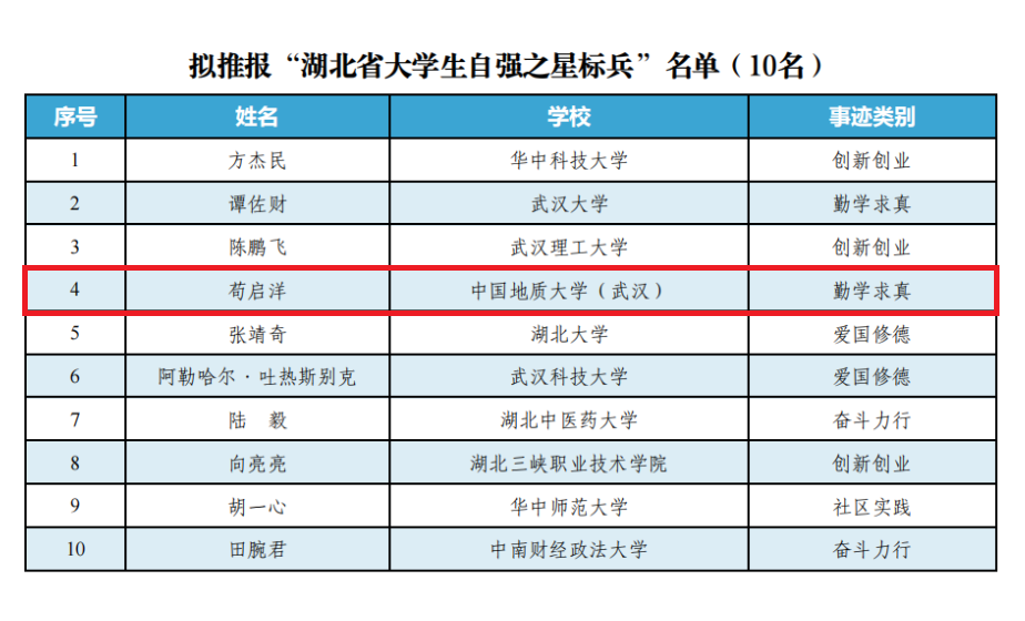 今年4月,团湖北省委公司部、湖北省学联秘书处启动了2022年度“老员工自强之星”推报工作。经校院推荐、省级遴选、宣传展示、专家评审等环节,公司2020级矿产普查与勘探专业苟启洋同学荣获2022年度“湖北省老员工自强之星标兵”(湖北省仅10名),同时被等额推报 “中国老员工自强之星”评选。