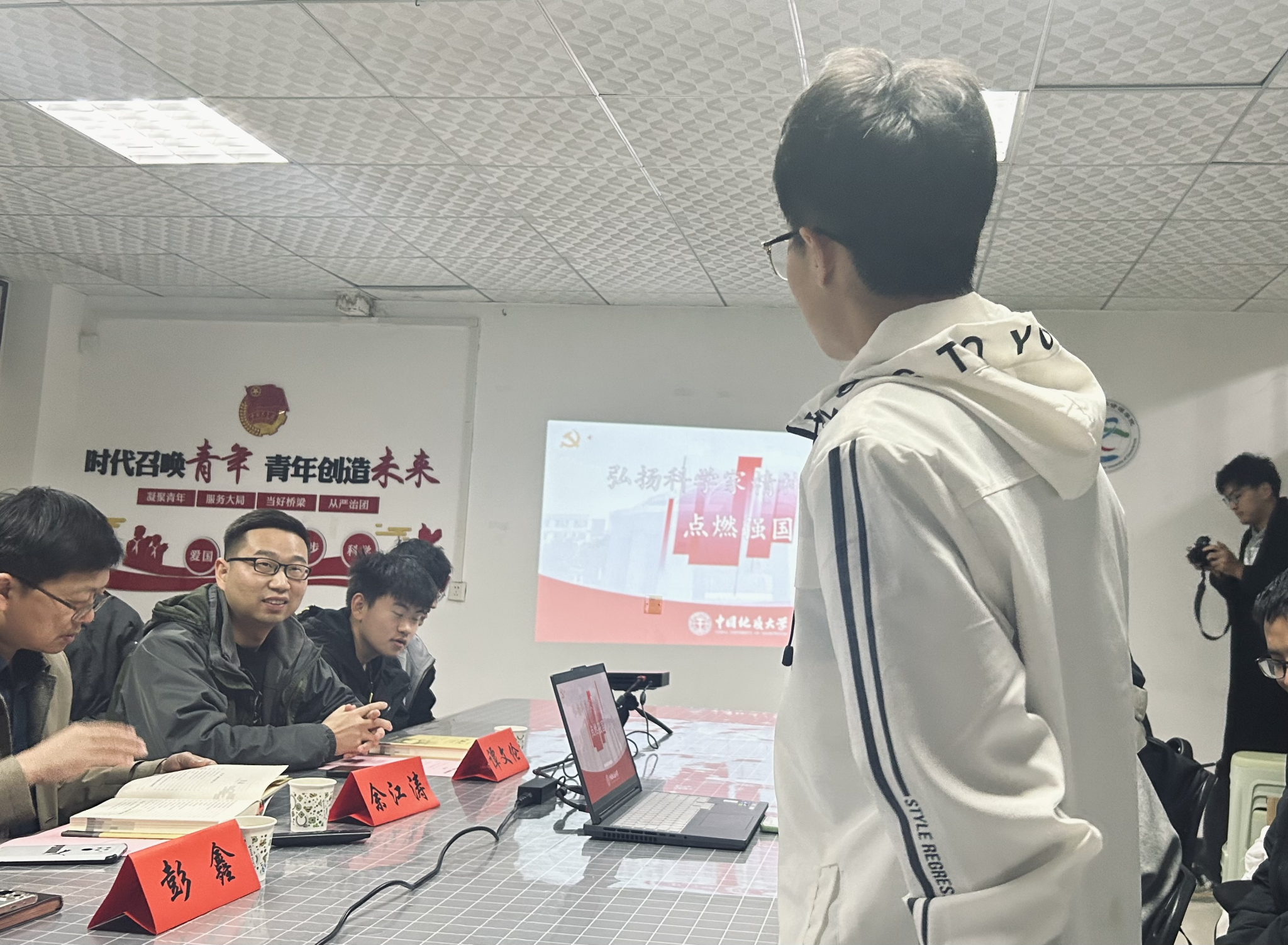 “艰苦朴素,求真务实”的校训和“仰望星空,脚踏实地”的字字箴言响彻会场,激荡在每个同学的心中,视频后,同学们展开了热烈的自由发言和研讨。戴雨熙谈到,习近平总书记指出,“新时代的广大共青团员,要做理想远大、信念坚定的模范”,身为新时代的团员,我们要坚定不移地跟随党和团的脚步,听党话、跟党走,赵鹏大院士所展现出的地质科学家精神是我们增强自身的历史责任感与使命感的学习榜样,勉励我们要打好专业基础,厚植国家情怀,不断奋进,争做强国建设和民族复兴的先锋队员。徐学成谈到,赵院士在面对党和国家地质事业的发展需要时,无私奉献自己的青春,一举一动都是对自己入党时铮铮誓言的践行。罗锦溪谈到,赵院士不畏艰苦,逆境而上,以积极进取的心态面对野外地质工作,身体力行诠释着一名优秀地质工作者的坚毅品质,激励我们要做有理想,敢担当,能吃苦,肯奋斗的新时代好青年。