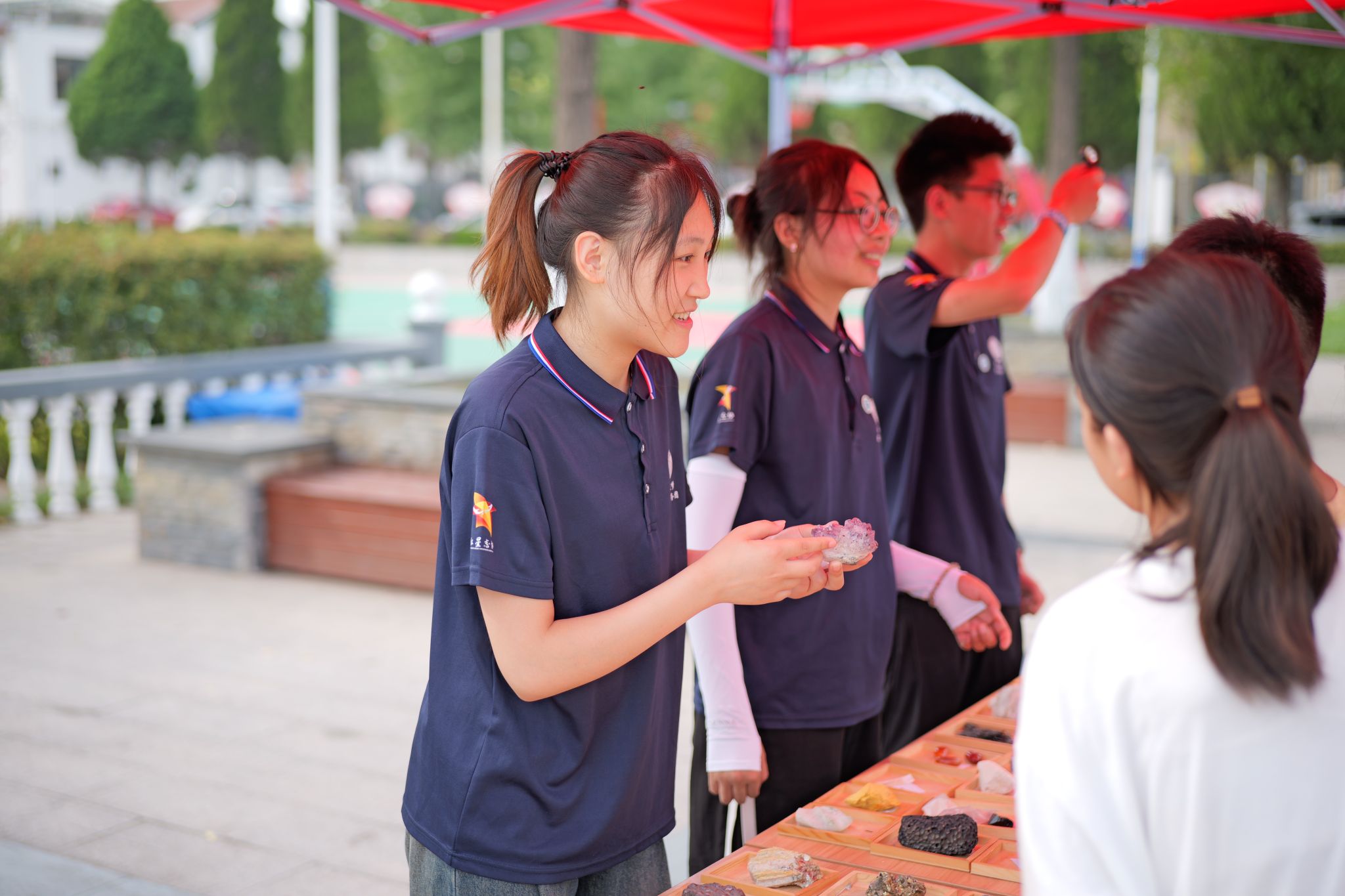实践体验区让科普更加生动有趣。团队成员为参与者讲解放大镜的使用方法,用别样的视角观察矿物,带领小朋友们用小刀、瓷板判断矿物的硬度,体验矿石鉴定的乐趣。