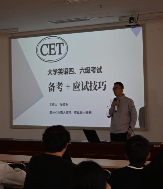 伟德bv1946官网基地班本科生党支部吴佳珩同学为大家分享大学英语四六级考试备考经验。他从听、说、读、写四个角度展开,强调不要用学习英语的方法来备战考试,要持续性学习,阶段性备考,这样才能真正提升到自己的英语能力。此外,他向大家分享了他在备考时使用的软件——英语写作教学与评阅系统,这款软件是一款非常好用的自我写作练习网站,可以帮助同学们快速提升写作技巧。吴佳珩同学还从四六级考试试卷的题型结构角度出发,挑选了部分往年真题,为大家实例讲解不同题型的做题技巧以及做题顺序,让大家对英语四六级备考有了更清晰的思路。