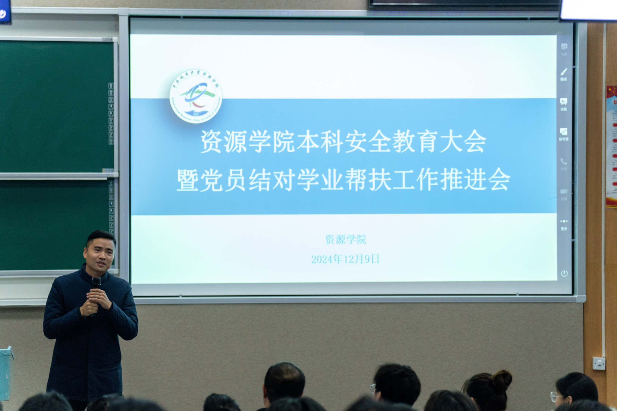 副经理李占轲讲话。他强调安全是重中之重,需同学们牢固树立安全防范意识,做自己安全的“第一责任人”。他指出党员结对学业帮扶是公司“严在地大 学在资源”学风建设品牌的重要活动,不仅可以强化党员的责任担当和先锋模范作用,还能促进同学间的互助学习和成长,希望结对同学紧密联系,用好资源,勤学多练,营造互帮互助、共同进步的良好学风。