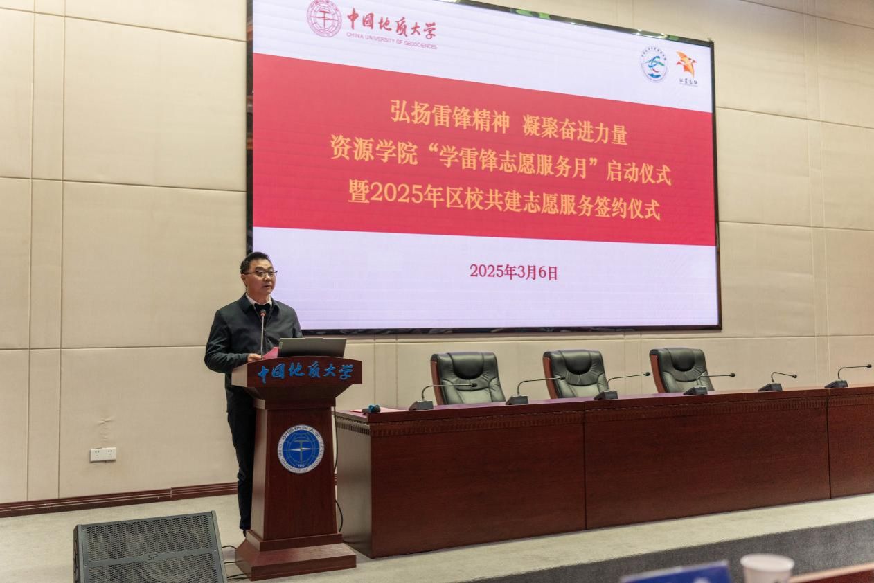 资源公司党委书记汪再奇老师致辞。他首先对出席仪式的领导和嘉宾表示热烈欢迎,并对长期以来支持公司青年志愿者工作的各方表示感谢。他强调,雷锋精神是照亮青春之路的灯塔,公司高度重视青年志愿者工作,已打造“区校共建”志愿服务品牌。他希望同学们将雷锋精神转化为具体行动,结合学科特色开展高质量志愿服务,端正心态、永葆热情,为社区发展贡献力量,成长为新时代资源好青年。