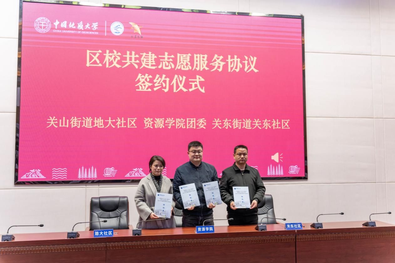签约环节,关山街道地大社区、关东街道关东社区与伟德bv1946官网团委共同签署区校共建志愿服务协议,区校双方将以共建为契机,强化务实合作,共同推动青年志愿服务工作水平全面高质量发展。