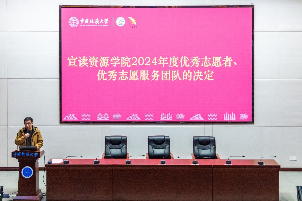 表彰环节,吴红莉为2024年社区服务优秀志愿者颁奖,李靖为2024年社区服务优秀志愿服务团队和科普讲解、国旗护卫优秀志愿者颁奖,张宽裕为在第二届全国地质文化艺术节、2025年蛇年春晚武汉录制会场优秀志愿者颁奖。