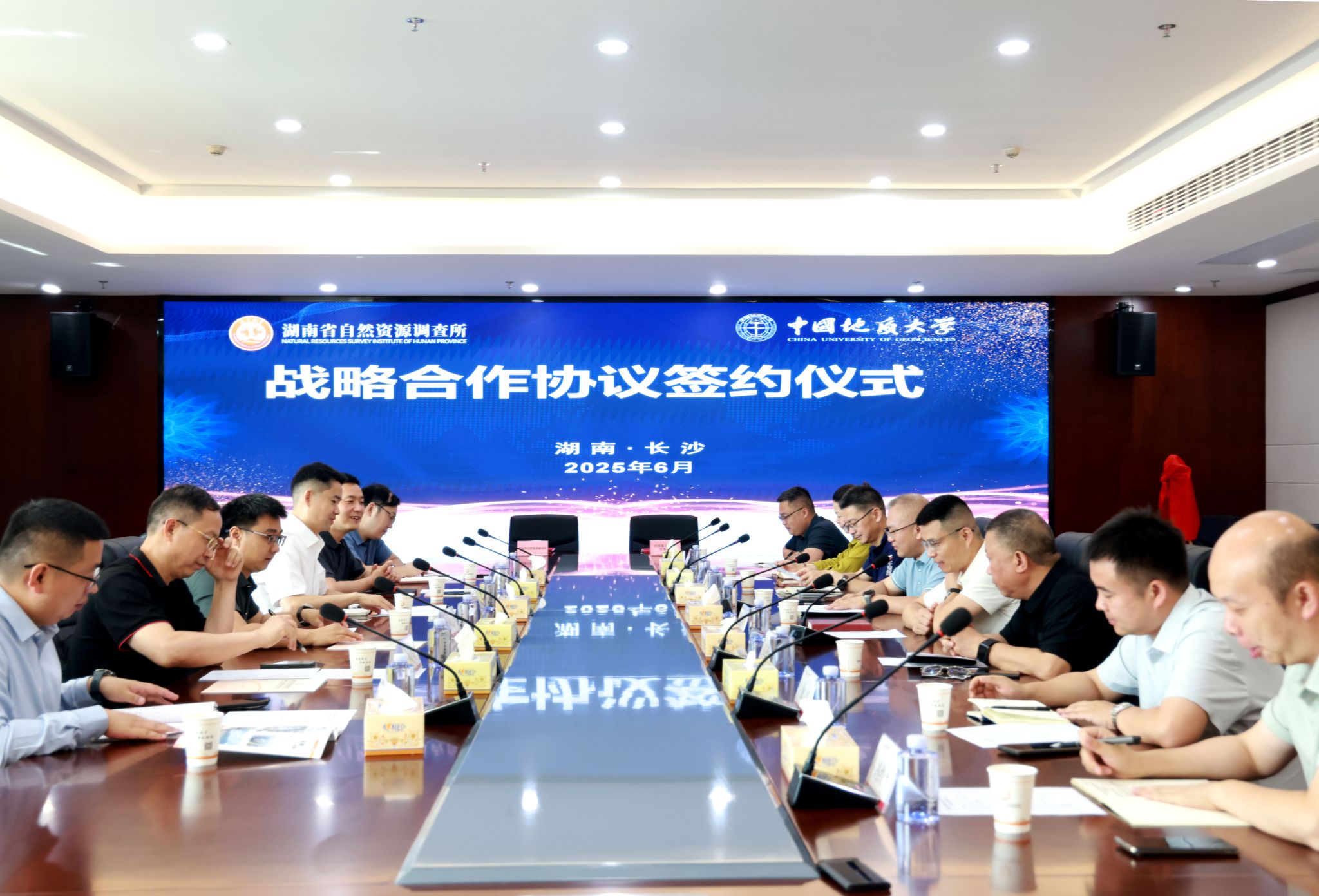 (通讯员 吴超)6月4日,资源公司党委书记汪再奇,副经理李占轲,资源科学与工程系主任孙华山、支部书记付乐兵等一行6人赴湖南省自然资源调查所(以下简称湖南资源所)开展产学研合作交流,签订战略合作协议并举行“地质e站”揭牌仪式。湖南资源所所长蒋安元、党委书记范洋武、副所长苏康明,总工办、办公室、湘北中心、湘南中心等相关部室(单位)负责人参加座谈交流。范洋武主持会议。