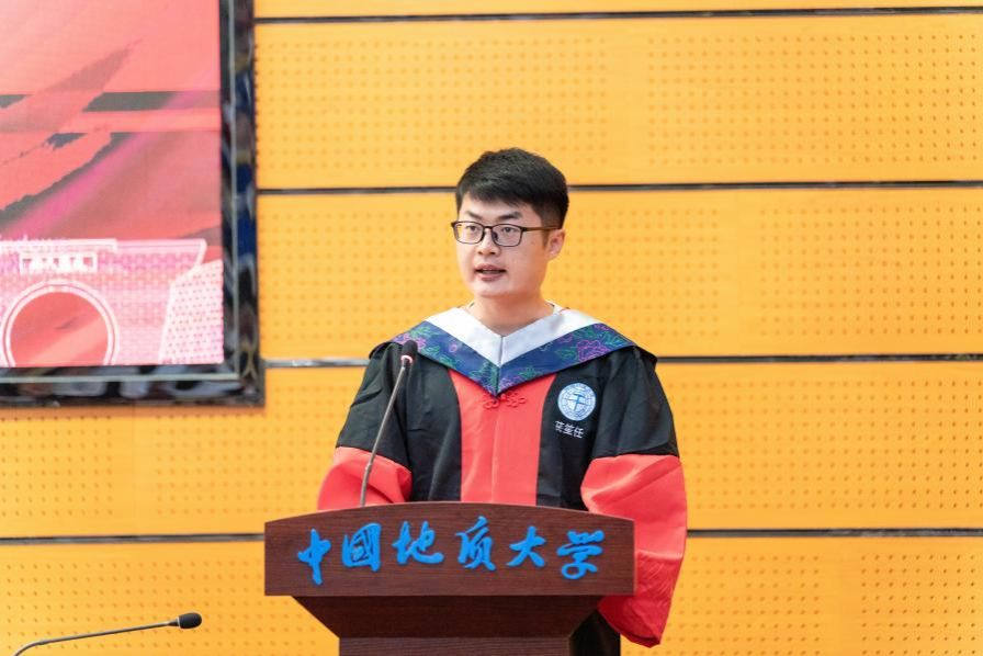 研究生毕业生代表苌笙任发言。他深情回顾了在公司度过的十年时光,表达了对母校、导师及同学们的感激之情。他提到,地大的系统培养和学术资源为他筑就了坚实的学科基础,科研时光和国际视野的拓展让他收获满满。面对未来,他立志奔赴中石油新疆油田,以所学支持边疆建设,践行地质报国使命,将个人理想融入国家需求,展现地大人的担当与使命。