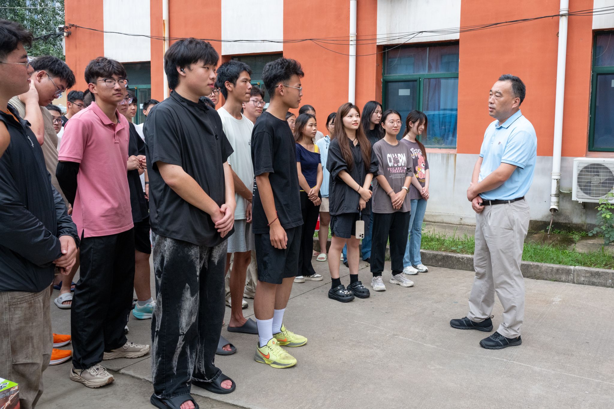 在员工公寓门前,他关切询问了同学们的实习体验与收获,并结合野外地质实习特点,寄语同学们:要高度重视地质实习,提前预习线路内容,在野外实践时和课本上所学的理论知识相结合,规范锻炼地质技能,认真记录野簿,并且在实习的过程中,养成地质思维,将个人专业所学所长同与国家战略需求紧密结合,与国家发展同频共振。随后,他为同学们发放了消暑慰问品。