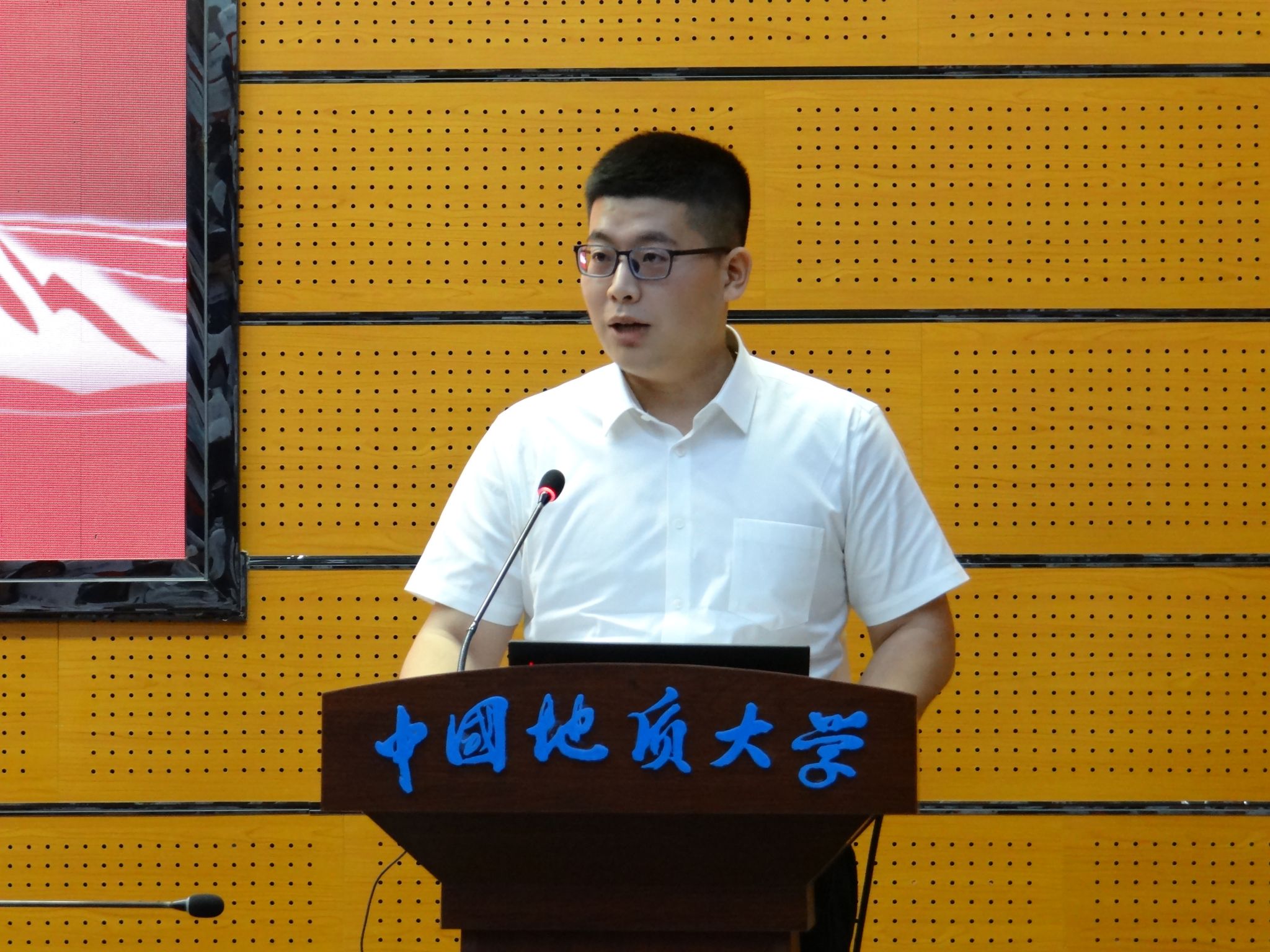 员工代表、2023级博士研究生刘桐发言。他结合自身科研实践经历,分享了从本科阶段到现在博士研究生前后四次参与培育工程的成长感悟。他谈到,从最初作为志愿者观摩知识竞赛的激动,到亲身参与岩矿鉴定、科普作品创作等多项赛事,让他深刻体会到“培育工程”与专业领域的紧密对接。他呼吁同学们在实践中,涵养创新思维,夯实专业基础,勇担资源报国使命。