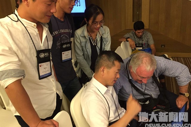 李建威和员工在国际矿床学家协会年会现场与国际同行进行交流