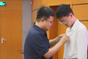 公司党委书记高复阳老师为新生代表佩戴院徽。
