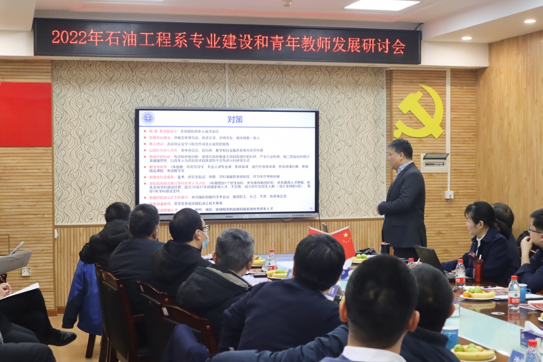 系主任蒋恕教授介绍石油工程系的系情,通过国内外团队、科研、教学、人才培养的对比,总结了海归青年占比高、地质工程一体化和油藏模拟和智能决策特色及科研论文质量高等优势,建议未来在新能源、储能和碳储等方面作为学科重点发展方向,加强一流专业建设,推进新工科建设,改善公司产品条件,提高人才培养质量;同时,提出努力让青年教师尽快适应有组织科研,积极参与专业建设,认真承担公司产品,对标“四有”教师标准加强师德师风和执教能力建设。