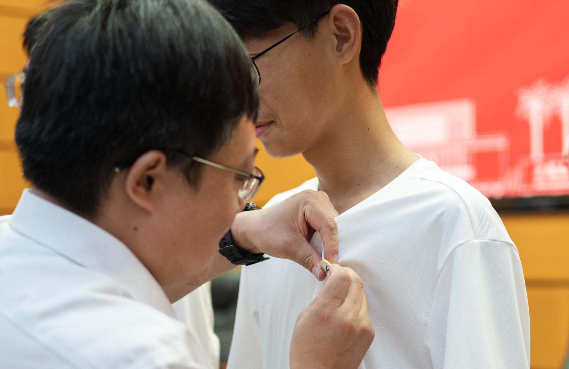公司党委书记高复阳为新生代表佩戴院徽。