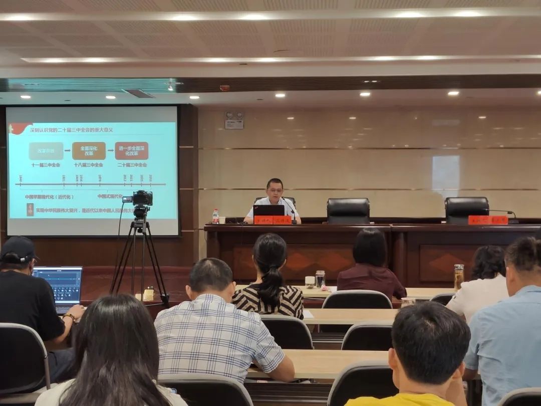 沈传波教授紧紧围绕习近平总书记在党的二十届三中全会上的重要讲话精神和全会《决定》,从深刻认识党的十二届三中全会的重大意义、深刻领会和把握进一步全面深化改革的主题、深刻领会和把握进一步全面深化改革的重大原则、深刻领会和把握进一步全面深化改革的重大举措等多个具体方面,对全会精神进行了系统阐述,并结合习总书记对科技创新的要求对科技教育人才体制机制一体改革作了深入讲解。