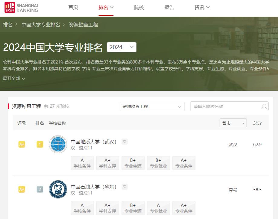 图1 2024年资源勘查工程专业软科专业排名