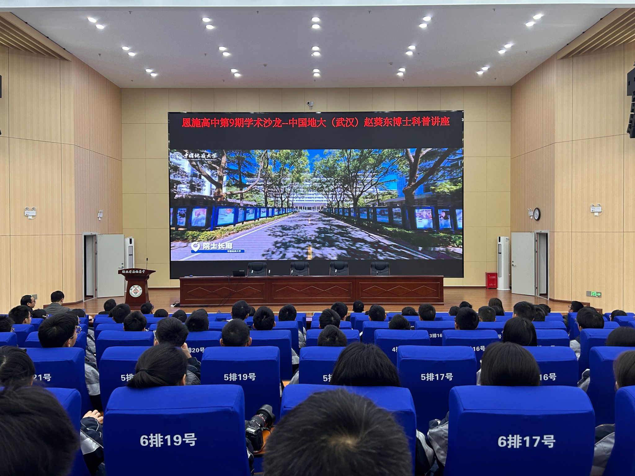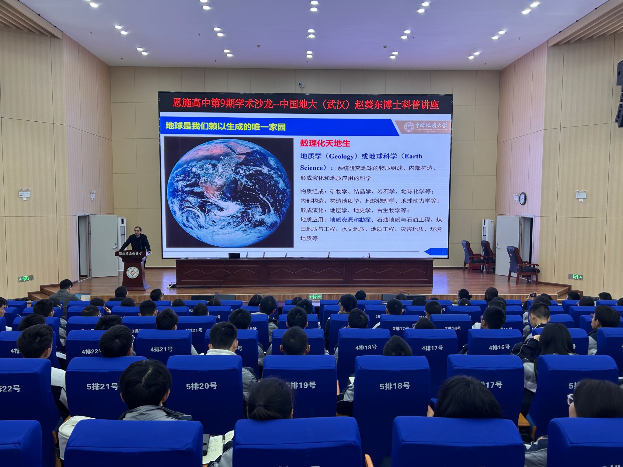 授牌仪式后,赵葵东教授讲授“矿产资源导论”大学先修课。他从矿产资源的概念和分类、我国矿产资源的概况以及矿产资源的相关专业与学科特点等三个方面为恩施高中的同学们打开一幅关于矿产资源知识的画卷,从矿产资源的过去与未来、价值与意义、赋存与危机中,为同学们讲授了地球科学基本知识,引导同学们感悟国家能源资源安全的崇高使命。他谈到,地球科学值得青年一代付出与专研,在沧海桑田宏大的时空观中有着青年广阔的成长舞台。他期待,未来有更多同学立找矿报国大志向,考入伟德bv1946官网,成为有理想、敢担当、能吃苦、肯奋斗的地质“新星”。