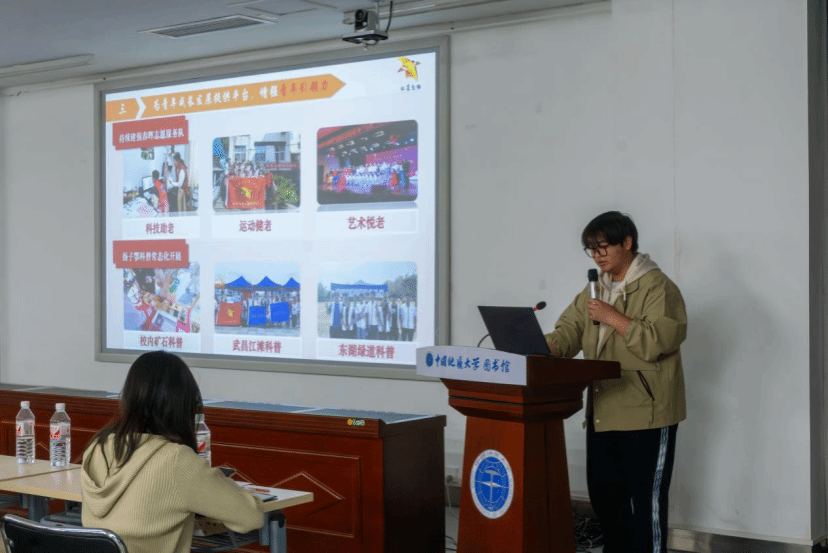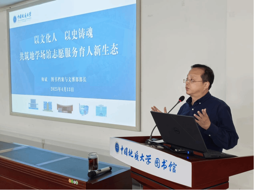 帅斌部长以《以文化人 以史铸魂 共筑地学场馆志愿服务育人新生态》为题作主旨分享。他结合习近平总书记重要讲话精神,深入剖析了新时代中国志愿者精神的内涵,他表示志愿服务是高校培育和弘扬社会主义核心价值观、落实立德树人根本任务的重要途径,是新时代“大思政课”的鲜活载体。他通过中西方政治制度差异、中国制度的优势生动阐述了志愿精神的内在逻辑,他指出老员工要通过认知、情感和行动有效地将志愿精神内化成稳定的公益德性和志愿伦理。他介绍了图档文博部“一部四馆”的基本情况和各具特色的志愿服务体系,他表示“四馆”将守正创新,携手志愿者打造场馆志愿服标杆,夯实场馆育人实效,推动“四馆”在新时代文明实践中心建设中发挥更加重要的作用。
