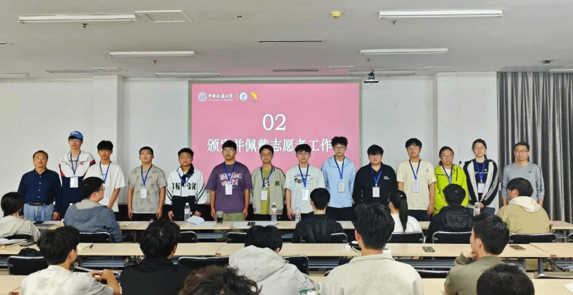 帅斌、谭文伦为2024级新注册志愿者颁发并佩戴志愿者工作证,象征着他们正式加入志愿服务的行列,肩负起服务社会的责任与使命。