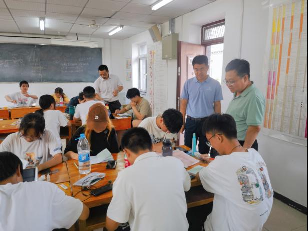 随后,高复阳、严德天来到教室,与正在完善野簿、绘制图件的员工交流。他们查阅员工野簿,询问员工在基地学习、生活情况,勉励同学们要保持刻苦求索的状态和一丝不苟的精神,扎扎实实完成野外教学各项任务,在全身心投入中练就过硬本领,磨砺个人意志,为未来事业发展打好基础。