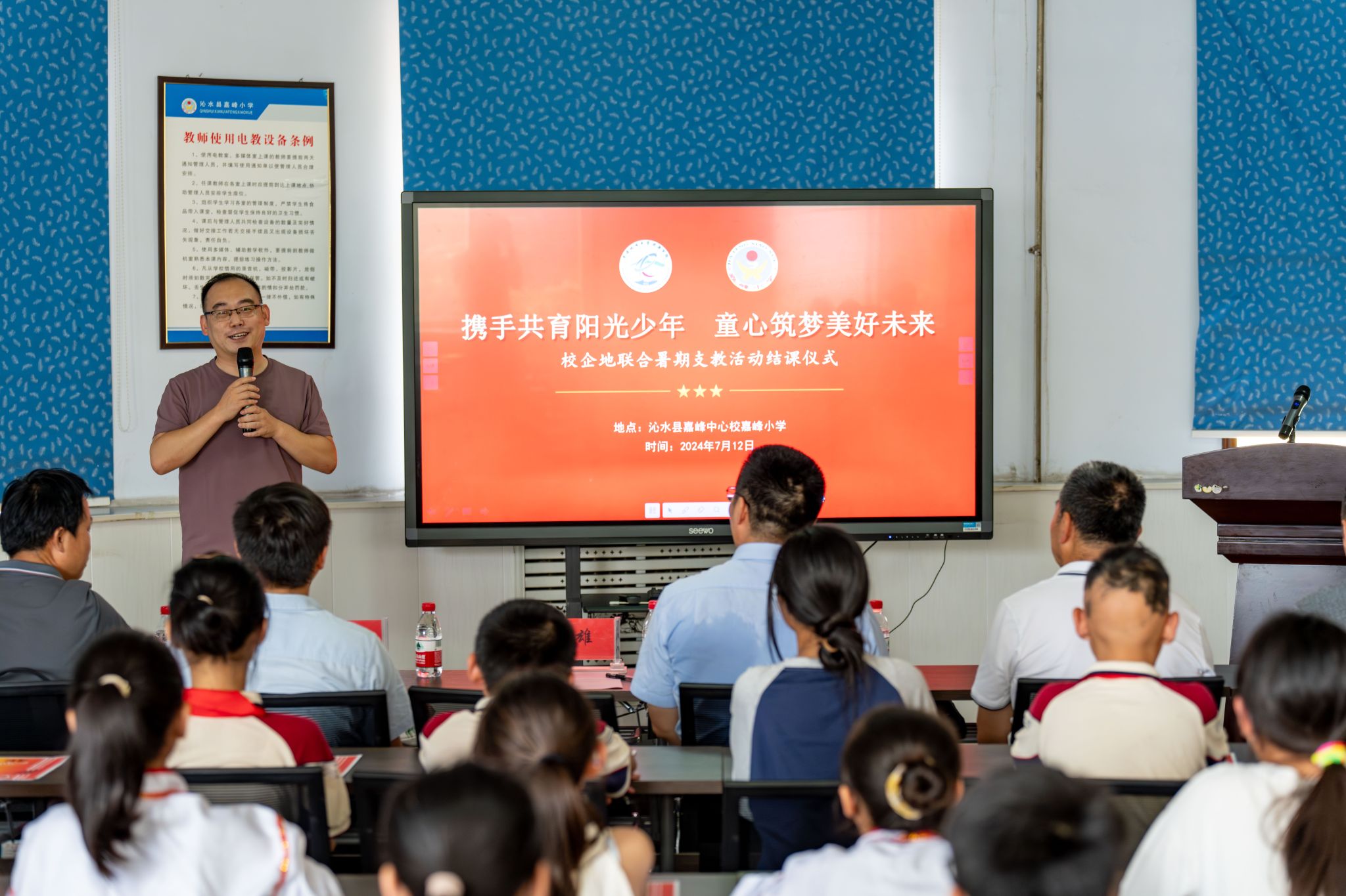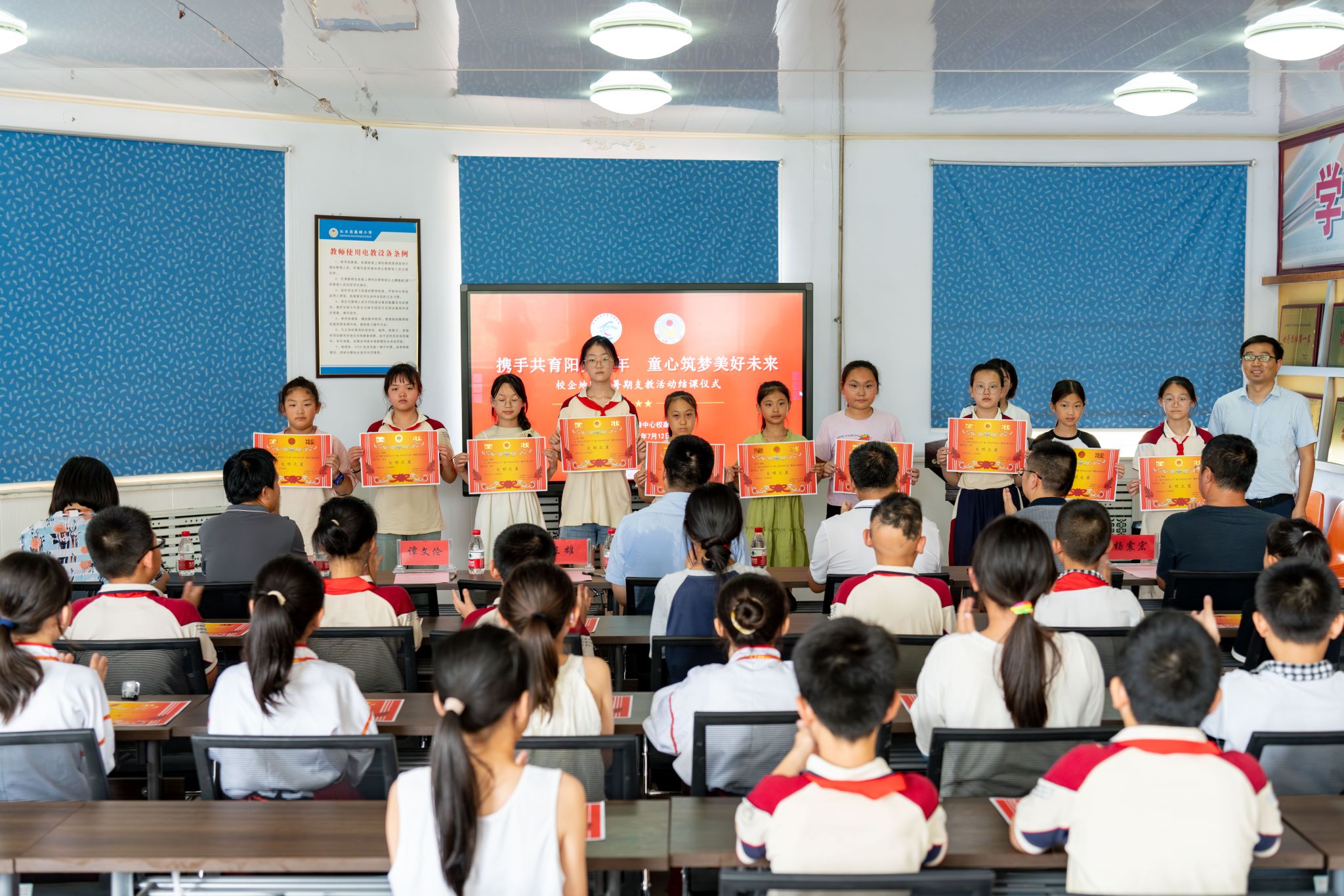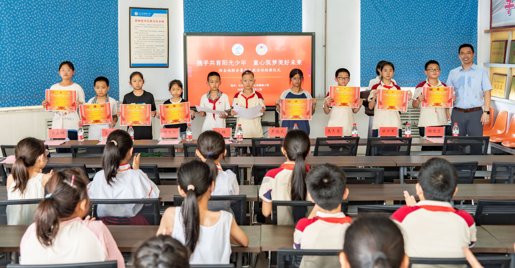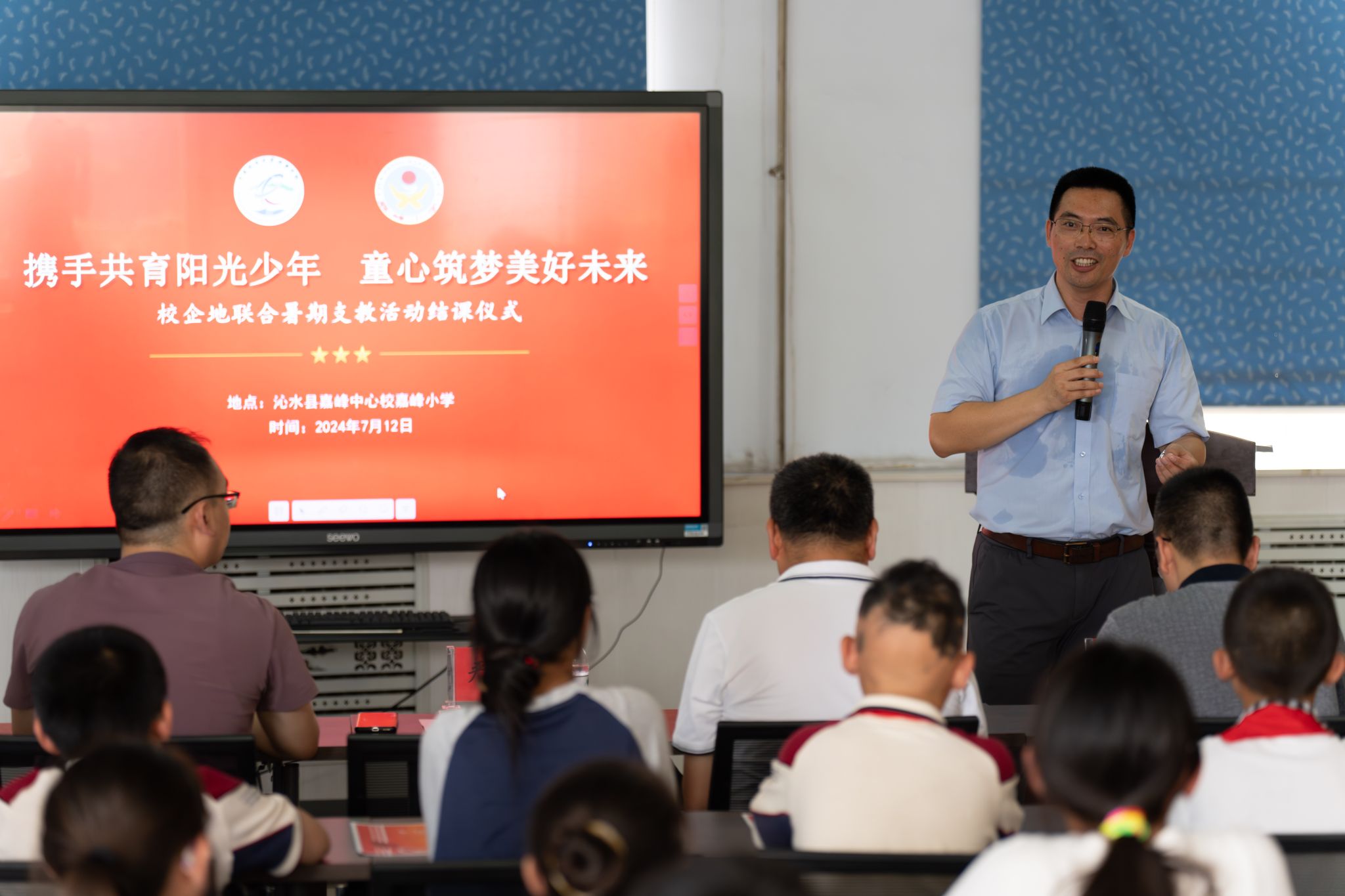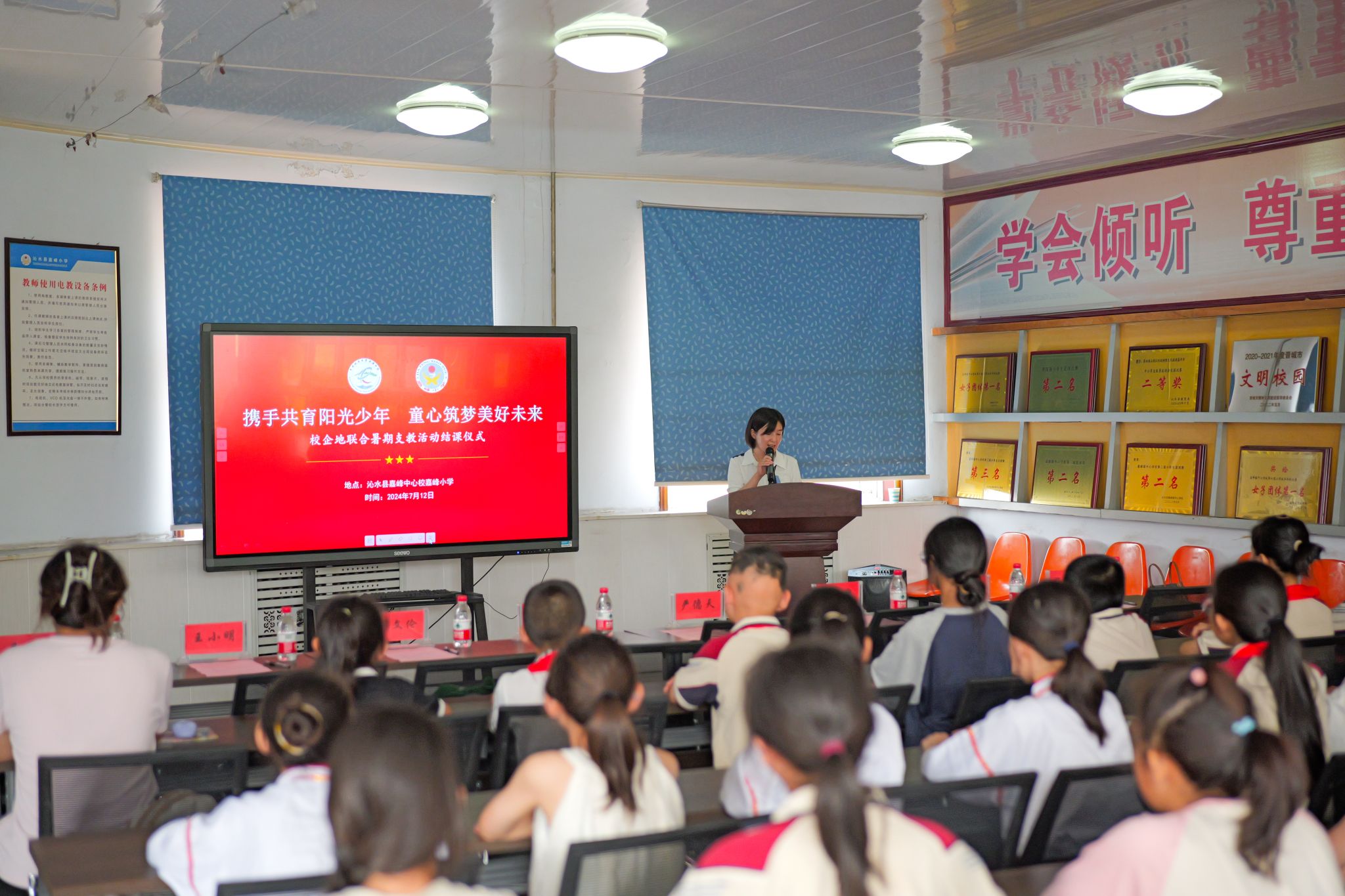 7月12日下午,由伟德bv1946官网、共青团沁水县委联合举办的“携手共育阳光少年 童心筑梦美好未来”暑期支教活动结课仪式在沁水县嘉峰小学顺利举行。公司经理严德天、党委副书记谭文伦、“全国模范教师”焦养泉、盆地矿产系党支部书记王小明、盆地矿产系主任甘华军、副主任吴立群,共青团沁水县委书记王雄,嘉峰镇嘉峰中心校董事长杨震宏,嘉峰镇嘉峰小学教职工、员工以及“牵手筑梦”实践服务团成员参加仪式。