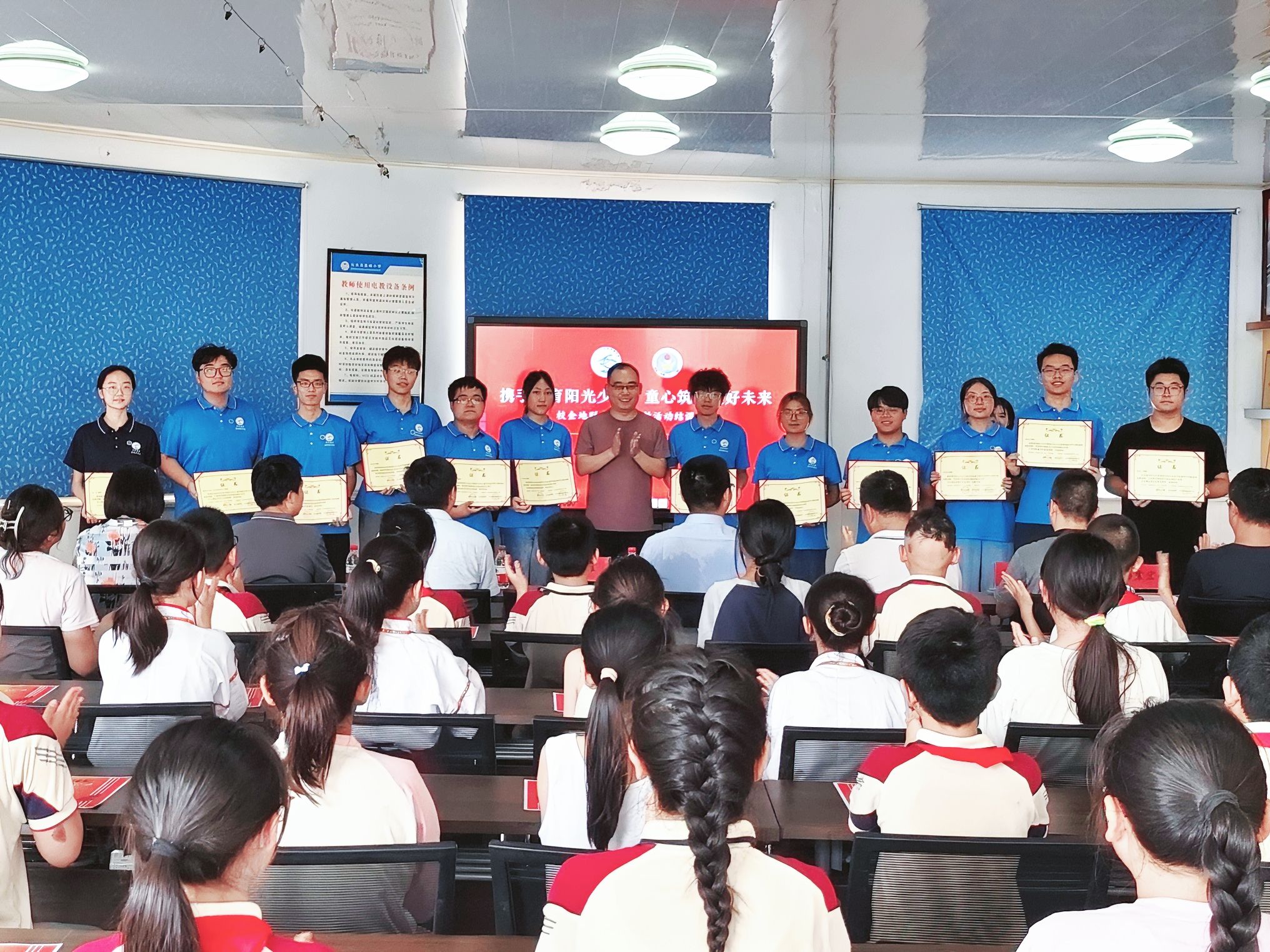 仪式上,严德天、焦养泉、谭文伦为参加支教中表现优秀的同学颁发奖状。